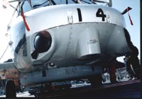 | 日本海上自衛隊的SH-60J型反潛直升機﹙圖一﹚,機內裝滿了電子裝備,機身塗裝是白色,並無任何隊徽標誌。SH-60J的特色是裝有AN/ASN-150型導航系統,連接一具TacNav導航電腦,AN/ASQ-8(V)2型磁異偵測器(MAD)﹙圖二左右兩側似眼睛圓狀物﹚,其它特色為在機身左側有二十五個發射孔的蜂巢狀發射器,發射聲納浮標;這些浮標包括主動式SSQ-60及被動式 SSQ-53聲納浮標,這些聲納利用氣壓式裝置,自機身左側彈射至海上,只要有敵潛艇通過,聲納浮標會立刻偵測到,然後依據潛艇的訊號顯示,立即標定位置加以攻擊。SH-60J有一個AN/APS-124的圓盤形雷達罩位於機鼻後下方﹙圖二下方圓盤﹚,用來偵測潛艇的潛望鏡。 |