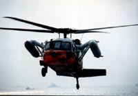 類似同形的UH-60J型救援搜索直升機﹙圖三、圖四﹚,源於美軍於越戰末期打擊救援的缺點,當時為了救援被越共擊落的美軍飛行人員,海軍要求HH53直升機及A-1戰機來支援並共同深入敵境擔負救援任務。由於低密度衝突的出現,必須依靠快速多功能的飛機,能夠在夜間深入敵境與友機共同執行救援任務,為了能夠秘密又快速救出特種部隊,因此,需要具備航程較遠達四百六十三公里,並 能救援送入、撤出特種部隊隊員至安全地點,依據此條件美國空軍產生HH-60H型直升機,再由此型衍生出UH-60J救難搜索直升機,為救援意外墜機的飛行員,日本海上自衛隊的UH-60J機上還裝有AN/APR39A﹙XE﹚雷達預警接收器、主動及被動式紅外線偵測器、AN/AR-47型飛彈警告器、全天候夜視裝置、地形追蹤雷達。 |