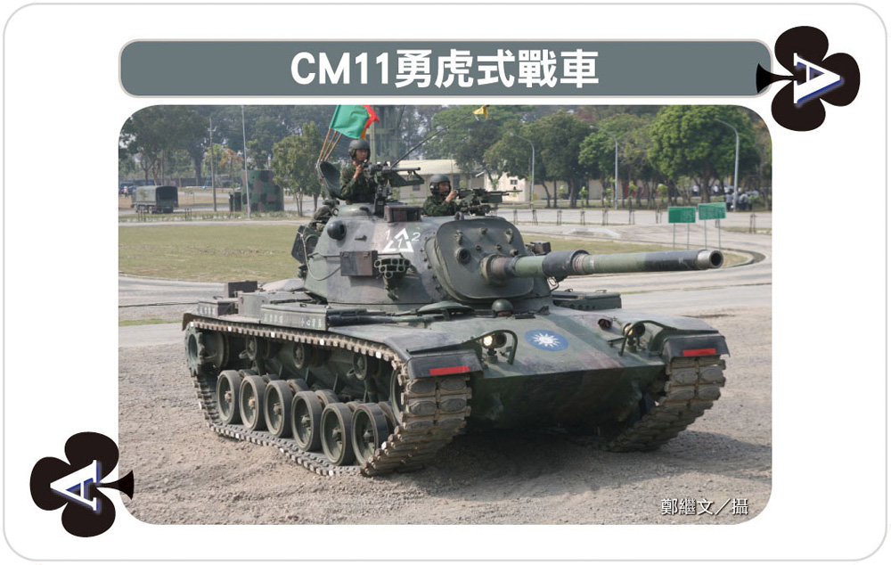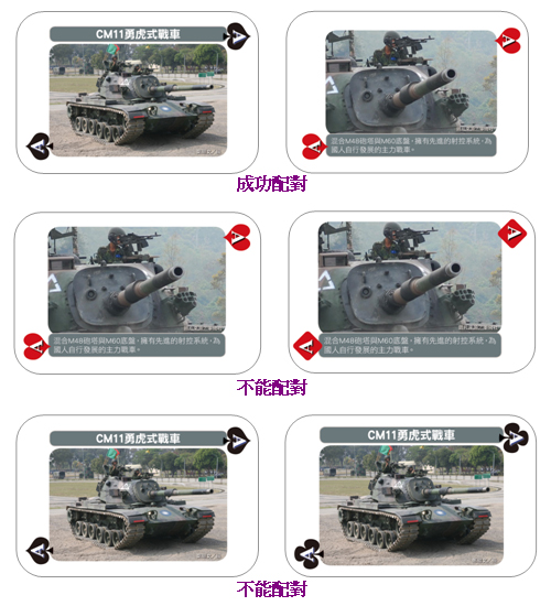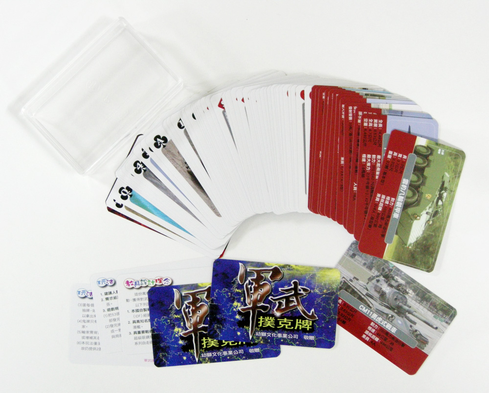 (五)武器撲克牌52張:與一般的撲克牌一樣印著黑桃、紅心、方塊、梅花等四種花色各13張,但我們在黑色牌,即黑桃、梅花的13張撲克牌上印了13種武器的全貌圖,如黑桃A的牌是「CM11勇虎式戰車」,梅花A也是「CM11勇虎式戰車」;而在紅色牌,即紅心、方塊的13張撲克牌則印上13種武器的局部特徵圖或是其配備武器圖,如紅心A的牌是截取「CM11勇虎式戰車」最特別的砲塔部分,下方並簡單說明該項武器的特色。