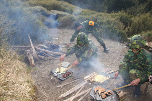 野戰求生是高寒地訓練的一項重要課程,受訓官兵運用現地的石板,採食野菜,在海拔3,000多公尺高山,炊事出色香味美的佳肴