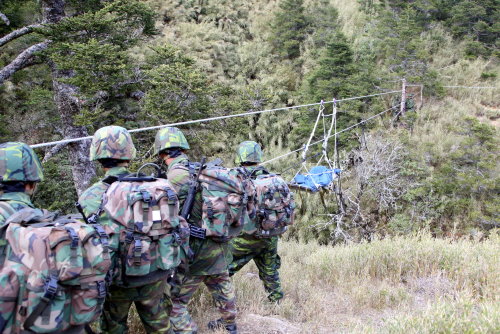 受訓官兵以繩索克服困難地形,利用萬能載具執行傷患、物資運送等訓練