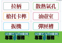 (二)部位名稱磁鐵上的文字顏色,與掛圖色系相同。如:「傳動機構」磁鐵文字為藍色,即屬左視圖上的部位名稱;「可拆式提把」磁鐵文字為暗紅色,則屬右視圖上的部位名稱。