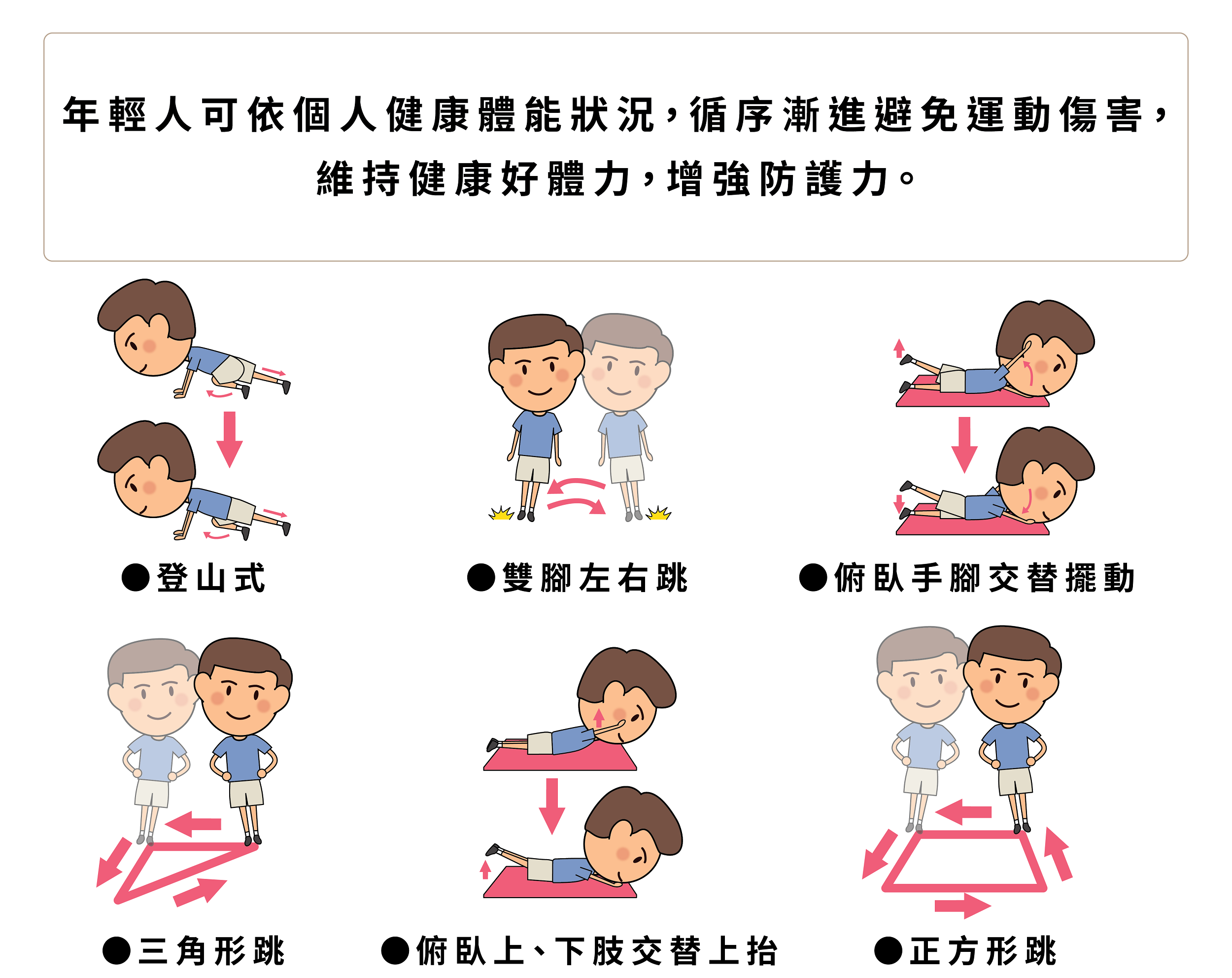 國民健康署提供6式燃脂運動影片,讓年輕人在家隨時可以開機暖身後訓練減脂增肌。每個動作做4次,6個動作做完算一組,建議每次進行5組運動,可依個人體能狀況進行調整,組間休息可依照個人體能狀況休息30-90秒。每天做2回,不但動得健康,也不用擔心宅在家體重會爆表。