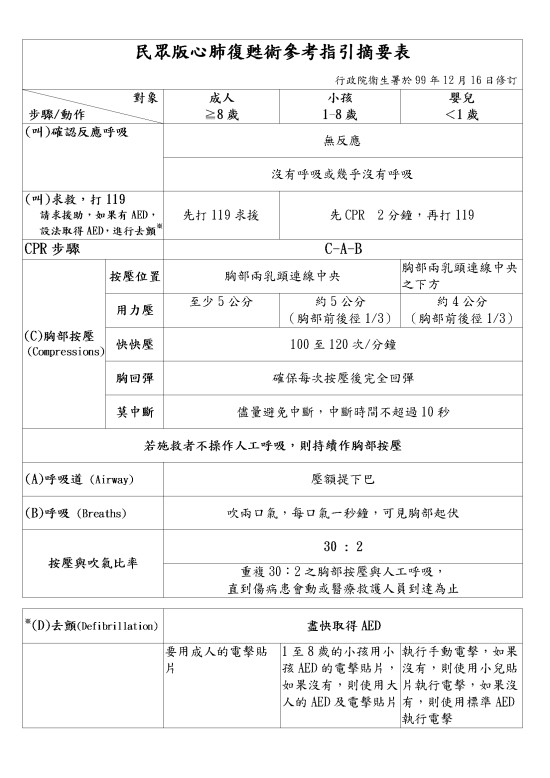 下表為行政院衛生署公布的「民眾版心肺復甦術參考指引摘要」,只要熟記簡易的步驟,一旦遇到緊急情況,即可救人一命。